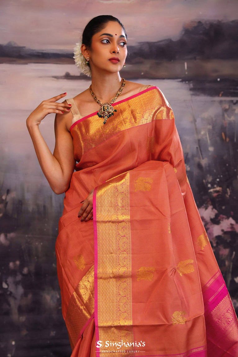 A deep orange kanjivaram silk saree adorned with traditional checks weave overlapped with peacock motif in gold zari. The contrasting big border and pallu features intricate floral and peacock motifs. Beautiful choice for festive celebrations and special events.