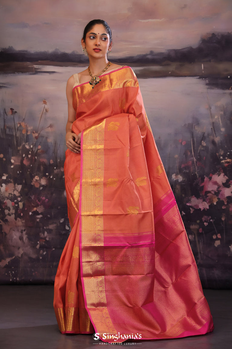 Deep Orange Kanjivaram Silk Saree With Contrast Border