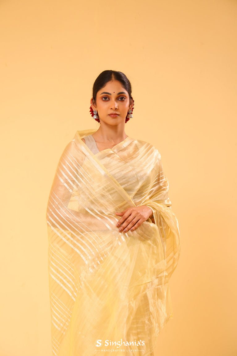 This is a flax gold tissue banarasi silk saree for festive, wedding occasions and party wear. Adorned with gold zari stripes weaving all over the body and very small border , completing the whole look.