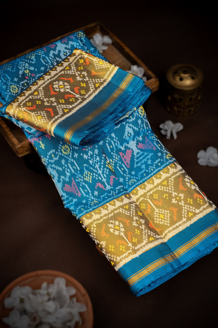 Mandir Peacock Blue & Olive Green Patan Patola Ikat Saree