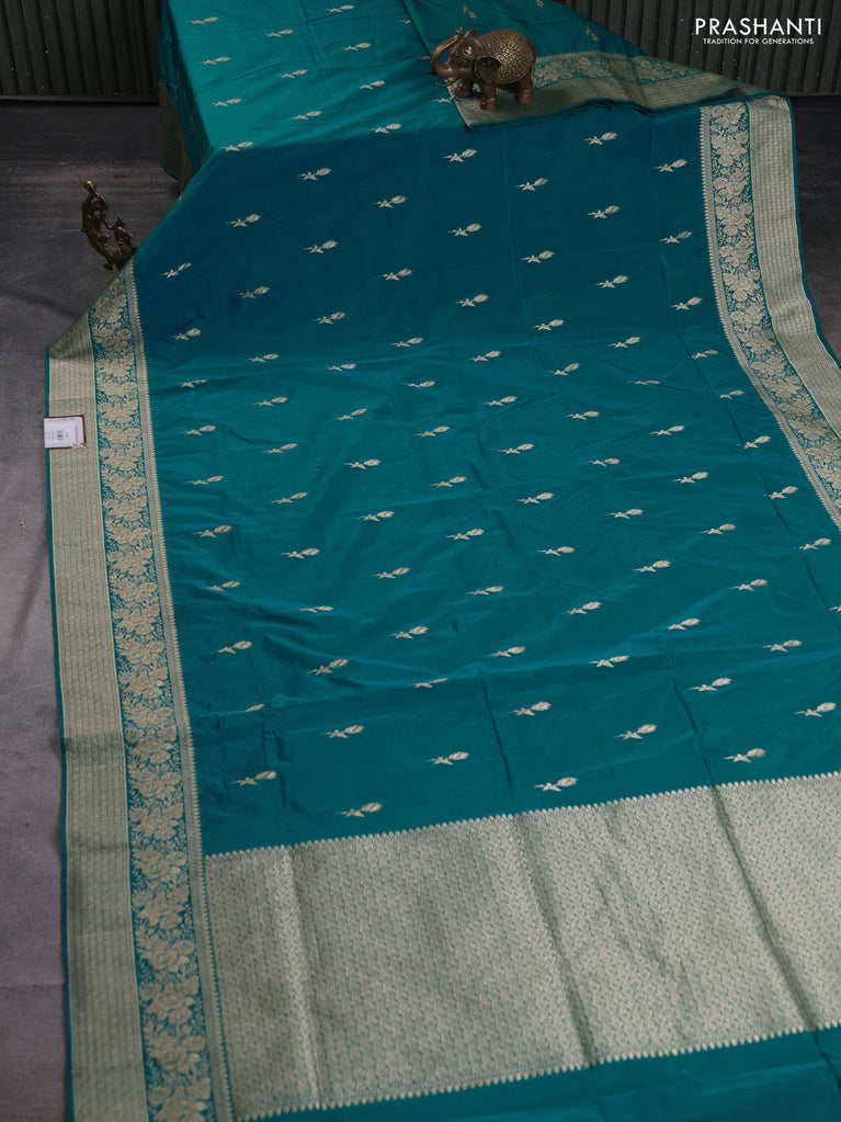 Banarasi semi katan silk saree dual shade of teal bluish green with floral zari woven buttas and zari woven border