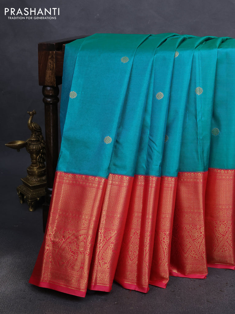 Bangalori silk saree teal green shade and magenta pink with zari woven buttas and zari woven border