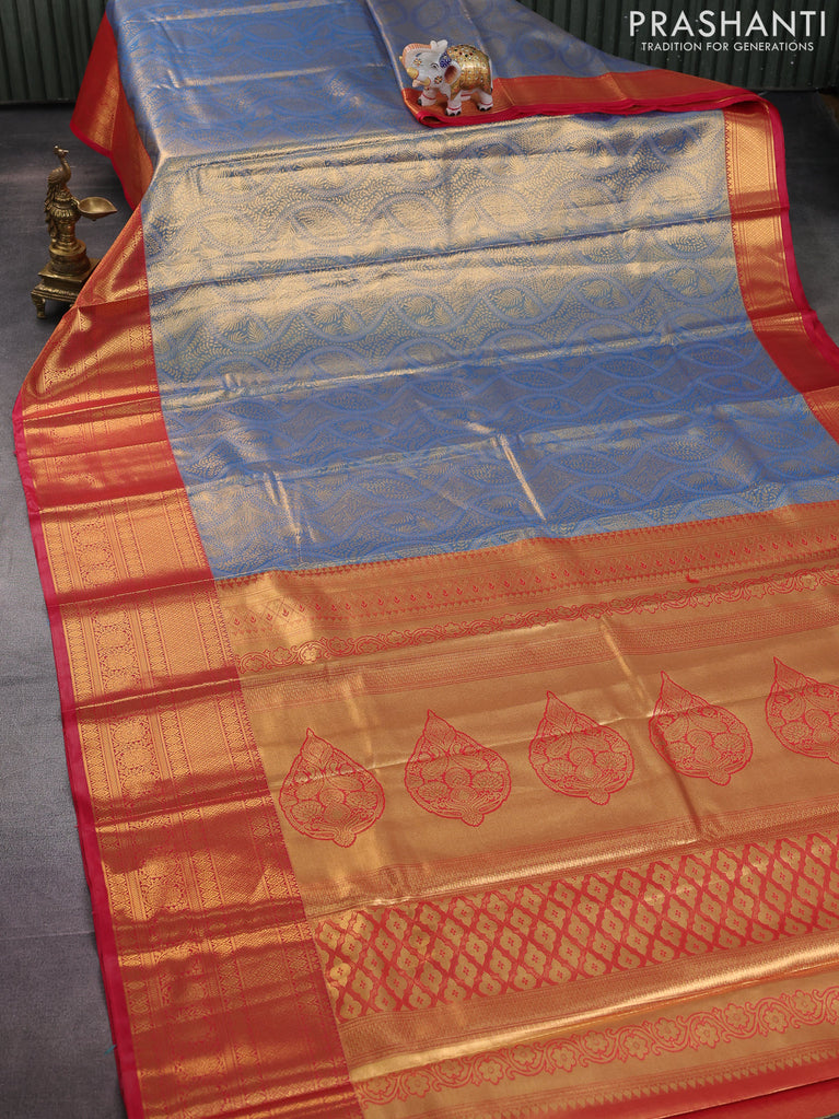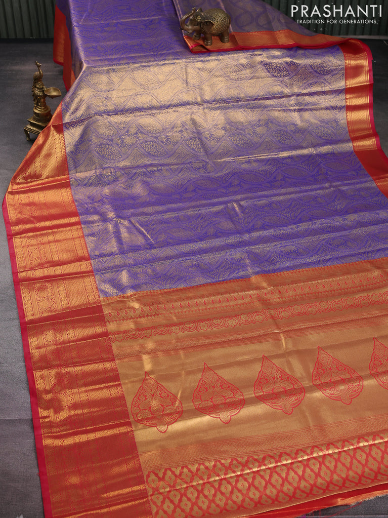 Bangalori tissue silk saree blue and red with allover zari woven brocade weaves and long zari woven border