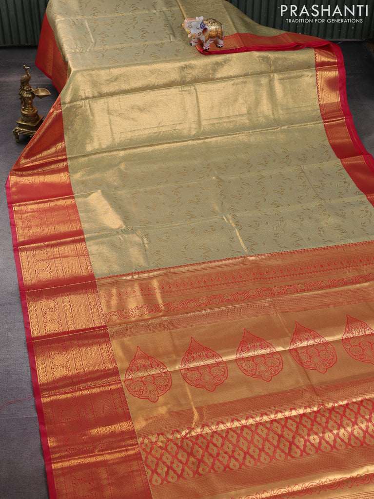 Bangalori tissue silk saree pista green and red with allover zari woven brocade weaves and long zari woven border