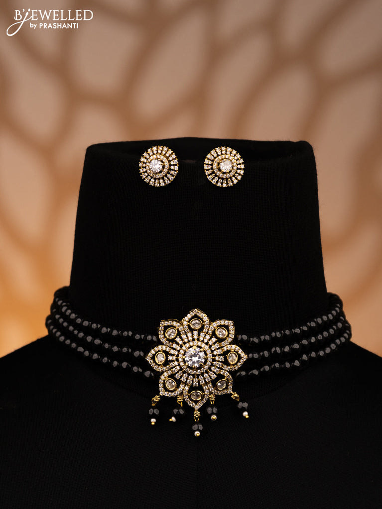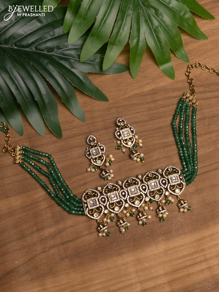 Beaded green choker with kundan & cz stones and beads hanging in victorian finish