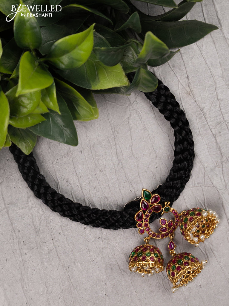 Black thread necklace with peacock design jhumka pendant kemp stone and pearl hangings without earrings