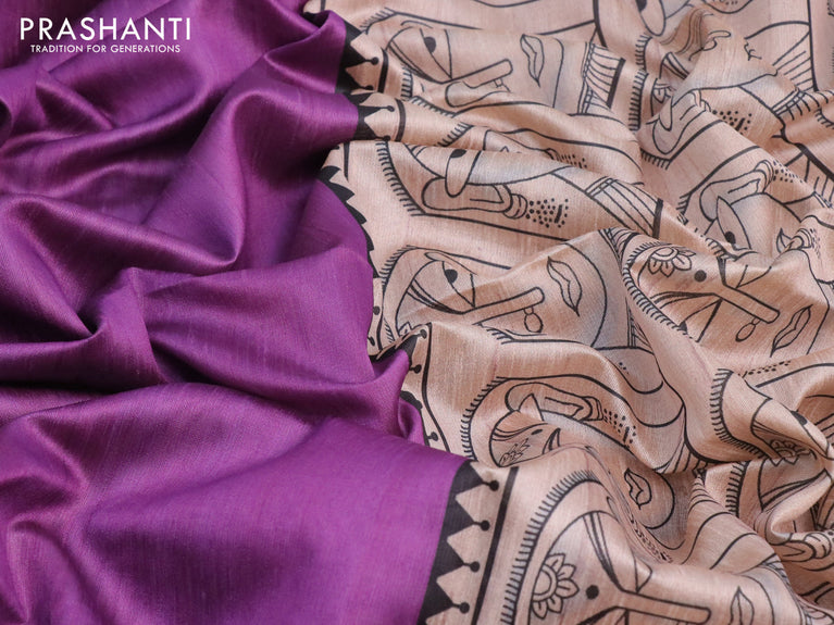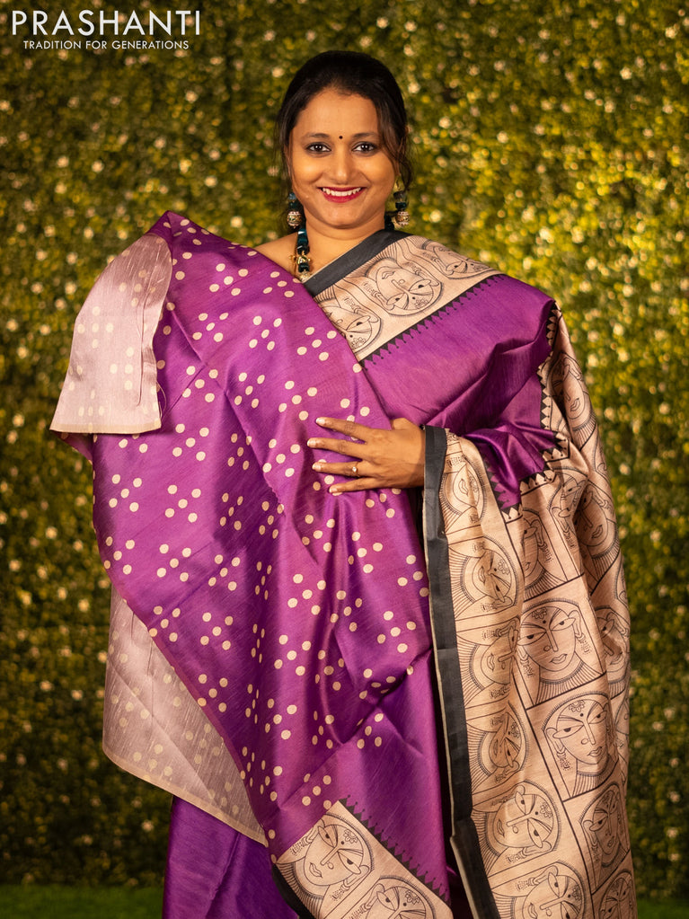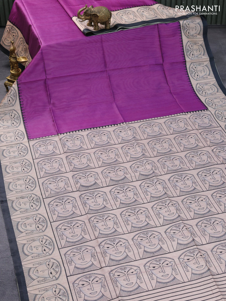 Chappa saree purple and cream with plain body and madhubani printed border
