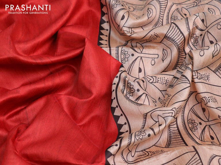 Chappa saree red and sandal with plain body and madhubani printed border