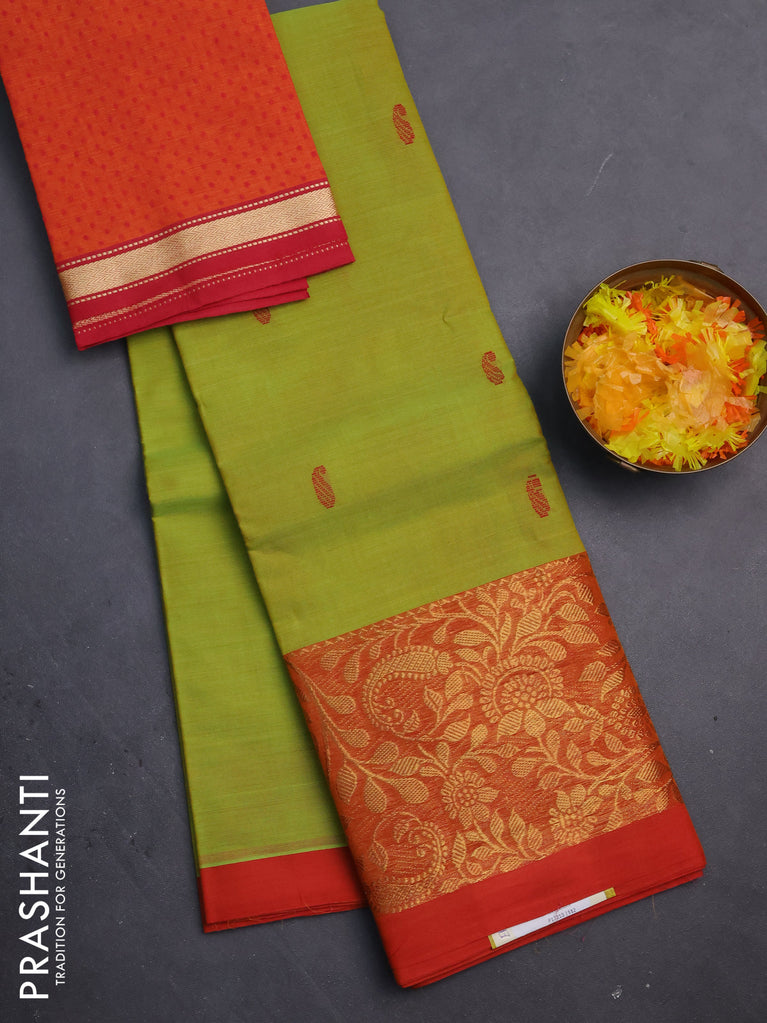 Chettinad cotton saree lime green and orange with thread woven buttas and long zari woven border
