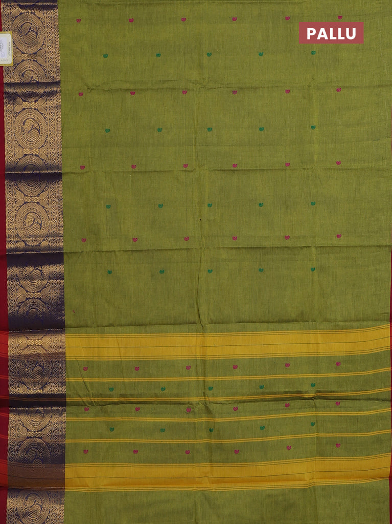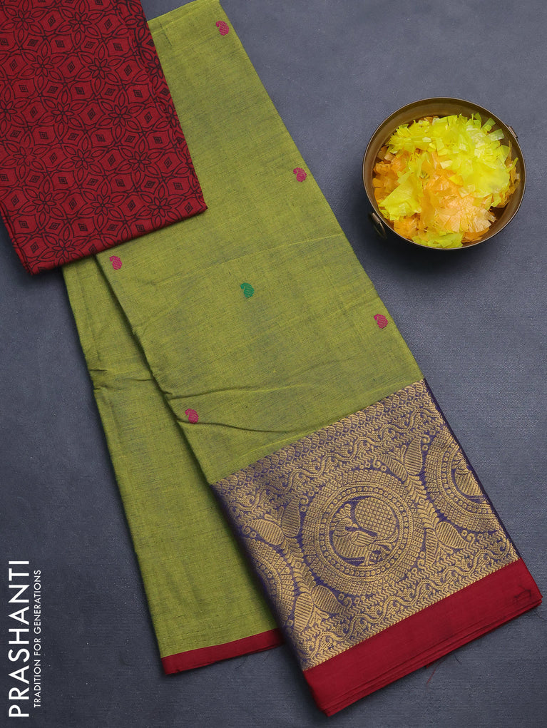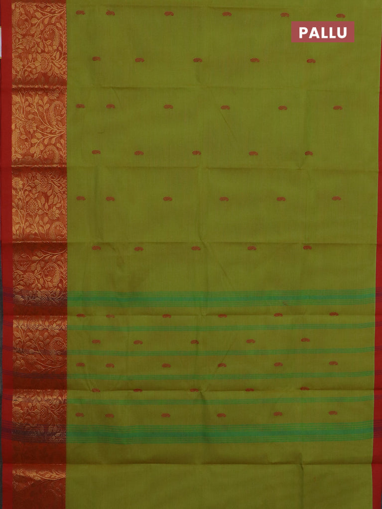 Chettinad cotton saree lime green and red with thread woven buttas and zari woven border