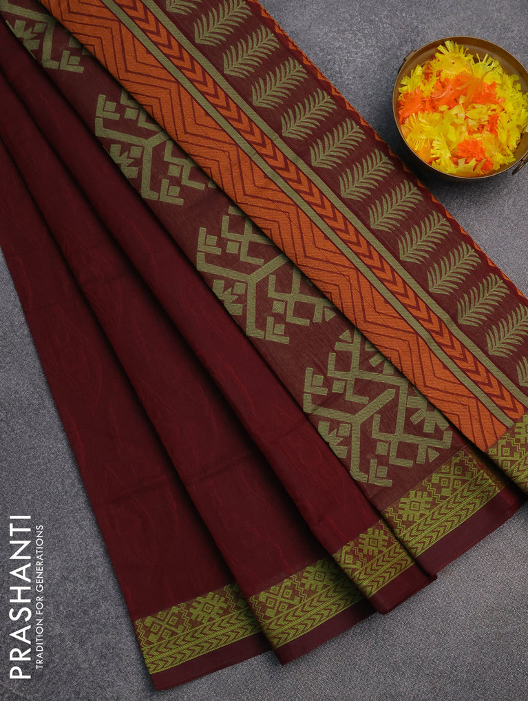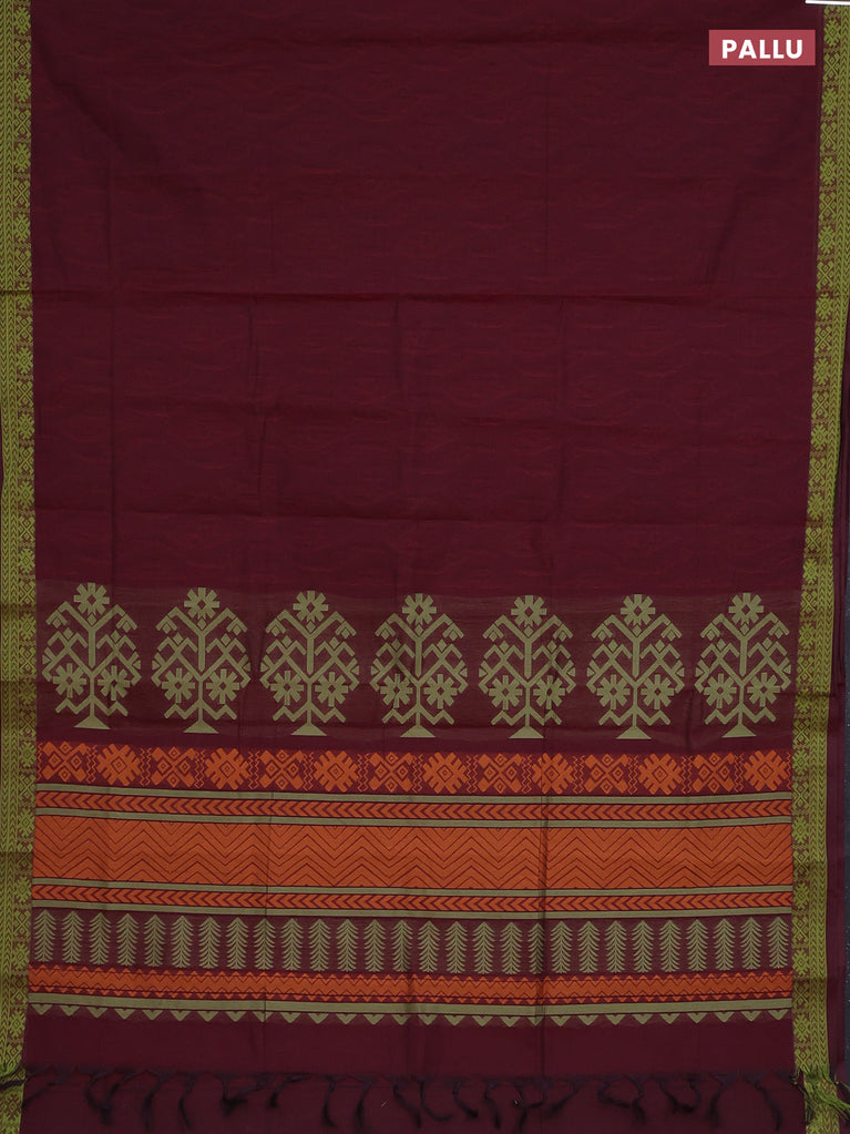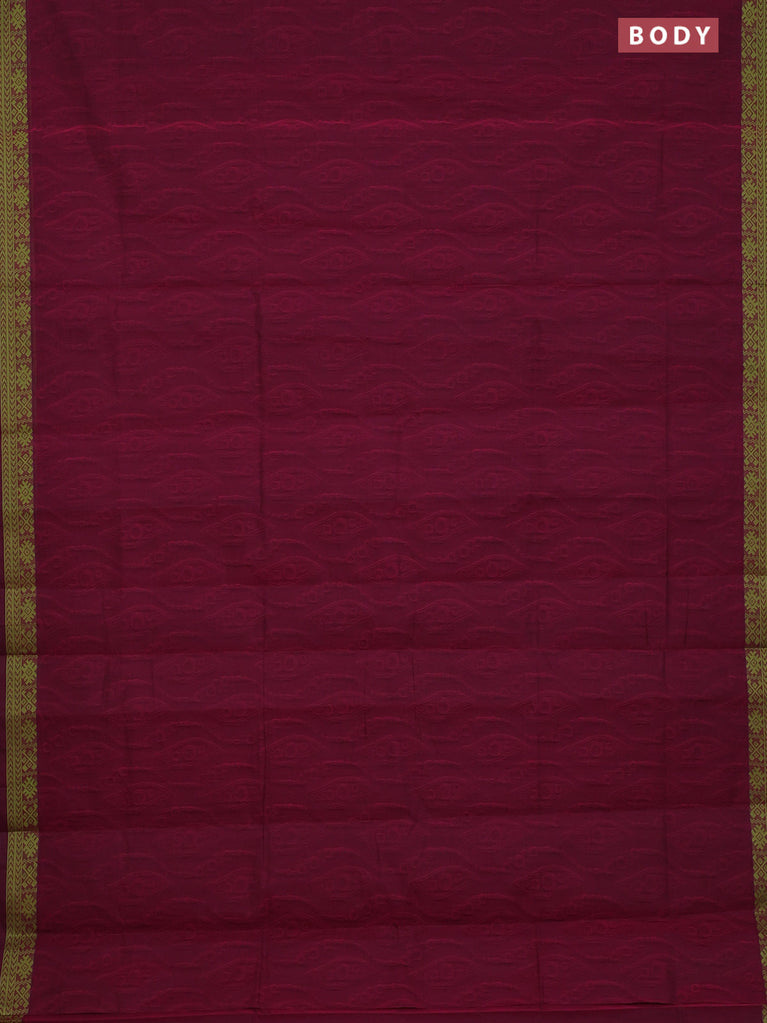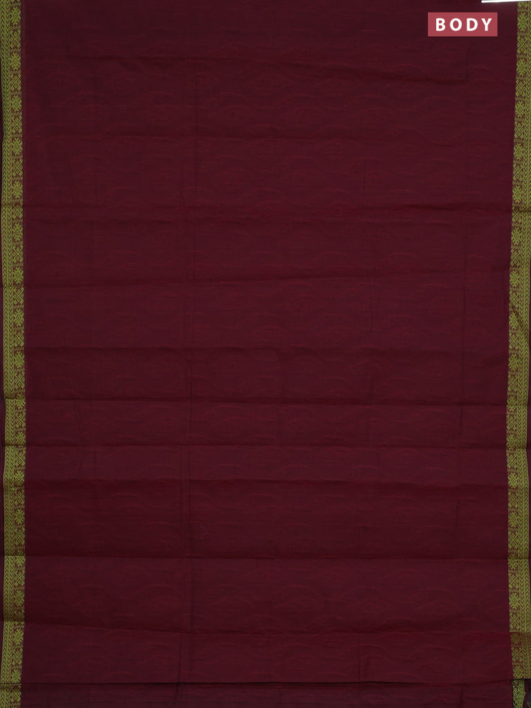 Coimbatore cotton saree maroon and light green with allover self emboss and thread woven border