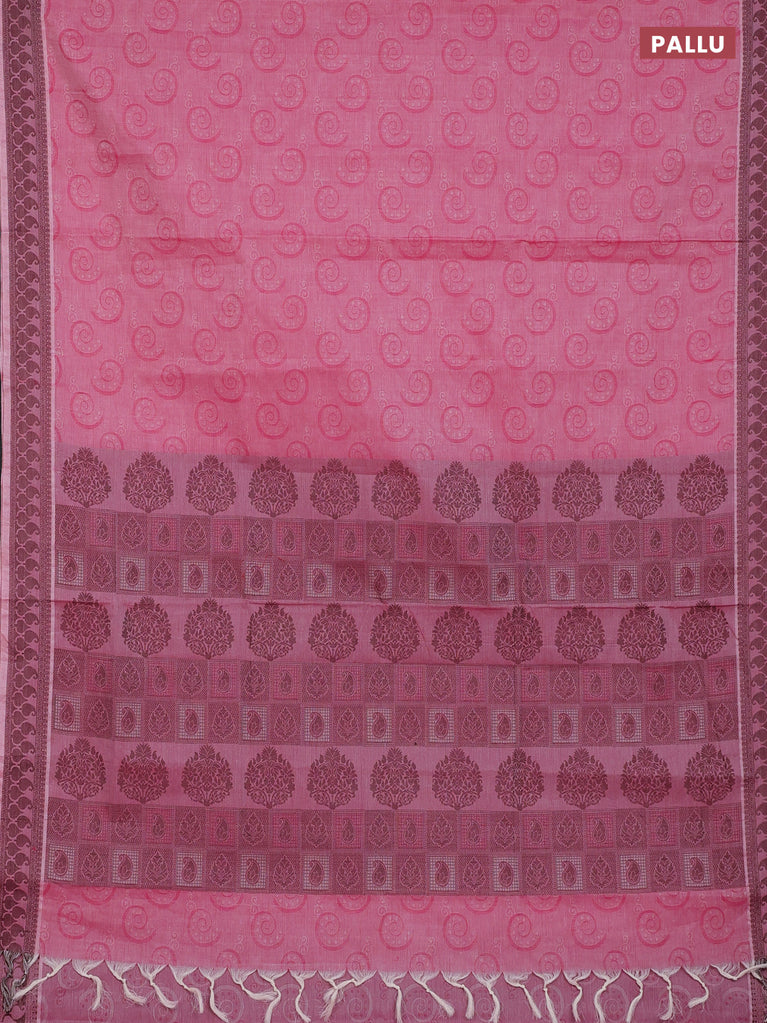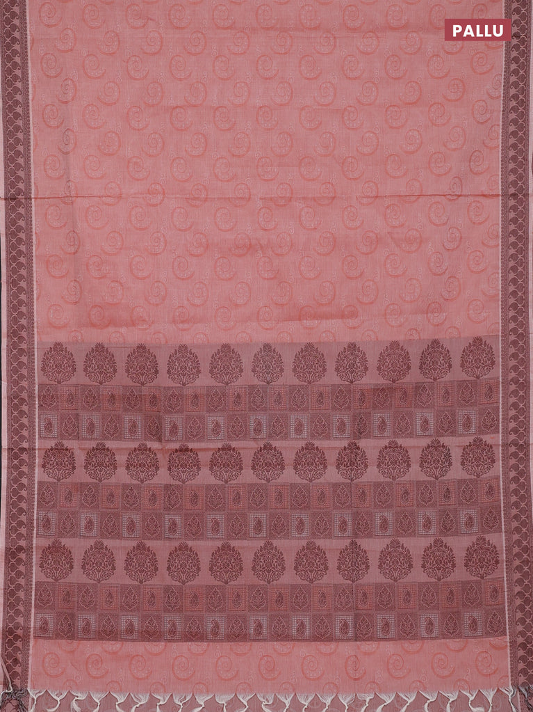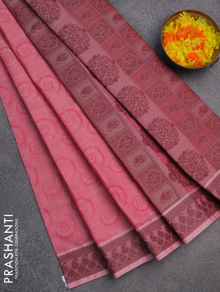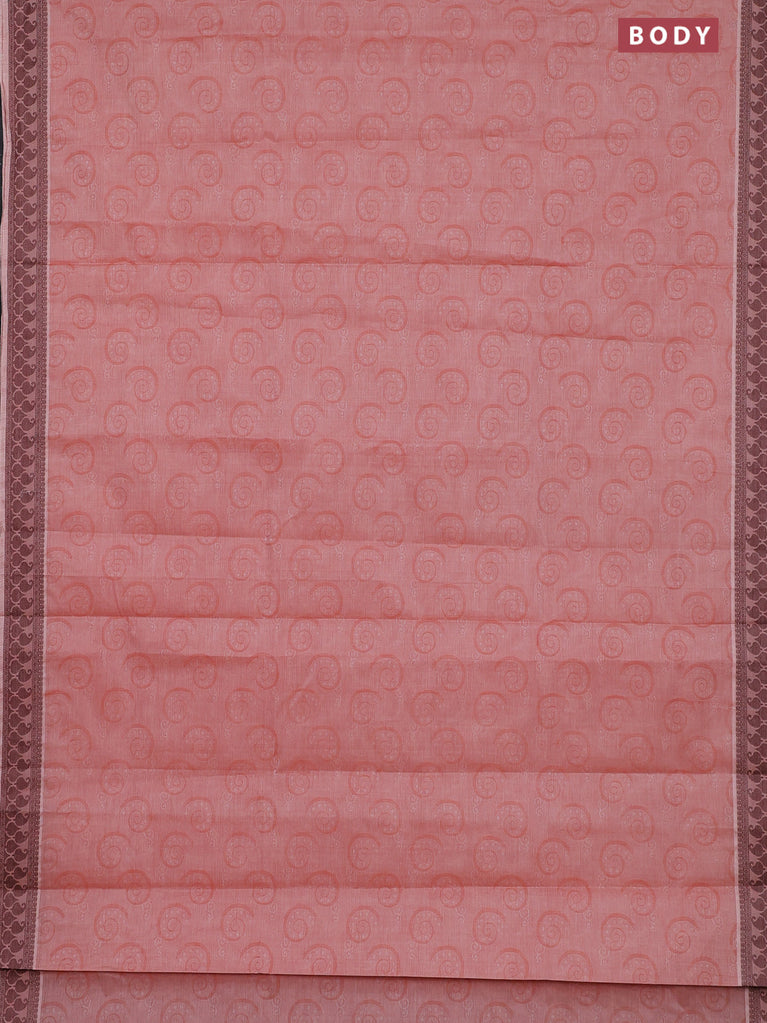 Coimbatore cotton saree pink and coffee brown with allover self emboss and thread woven border