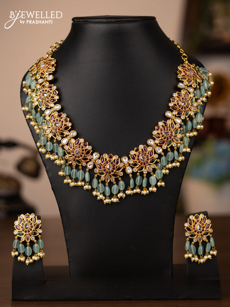 Antique necklace lotus design with kemp & kundan stones and pearl & beads hanging