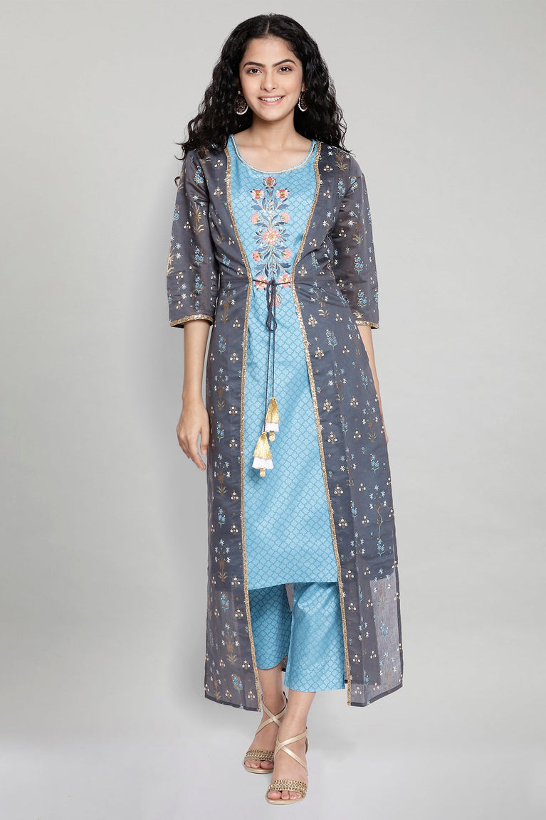 Blue Embroidered Yoke Pure Cotton Straight Kurta and Pants Set