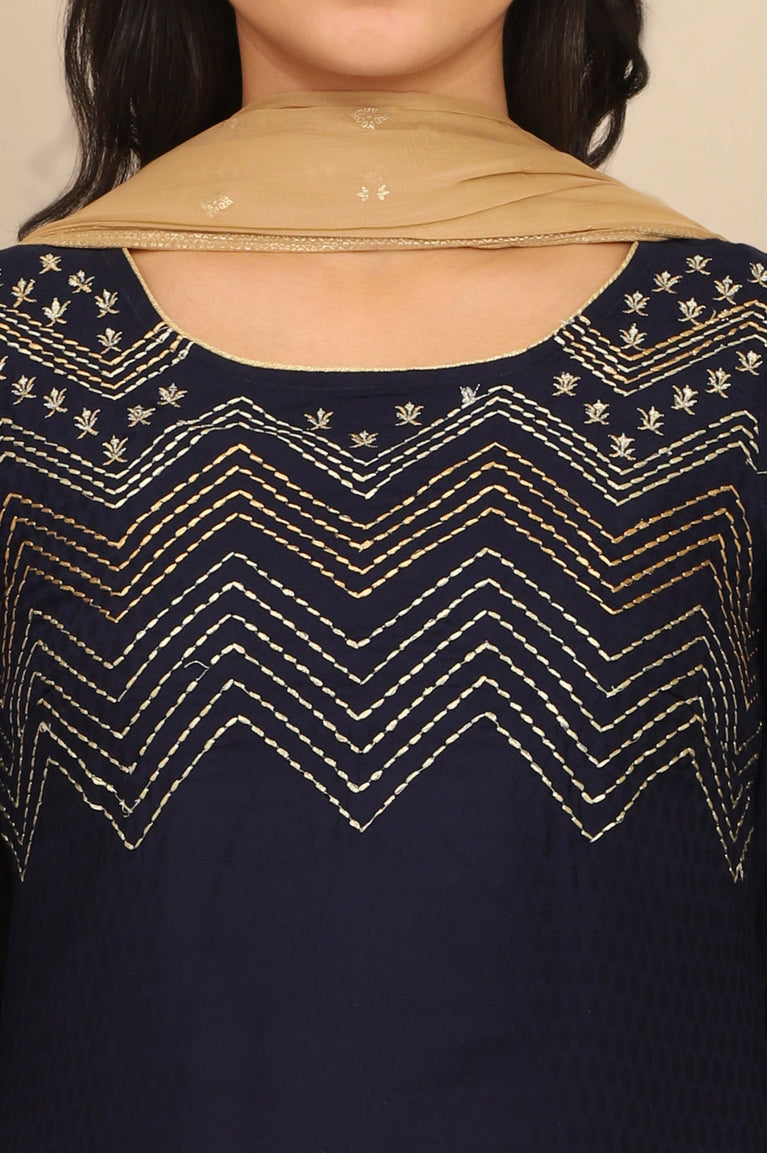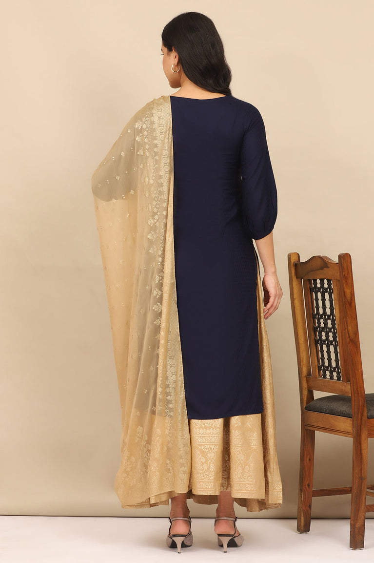 Blue Embroidered Textured Rayon Straight Kurta, Golden Printed Skirt and Dupatta Set