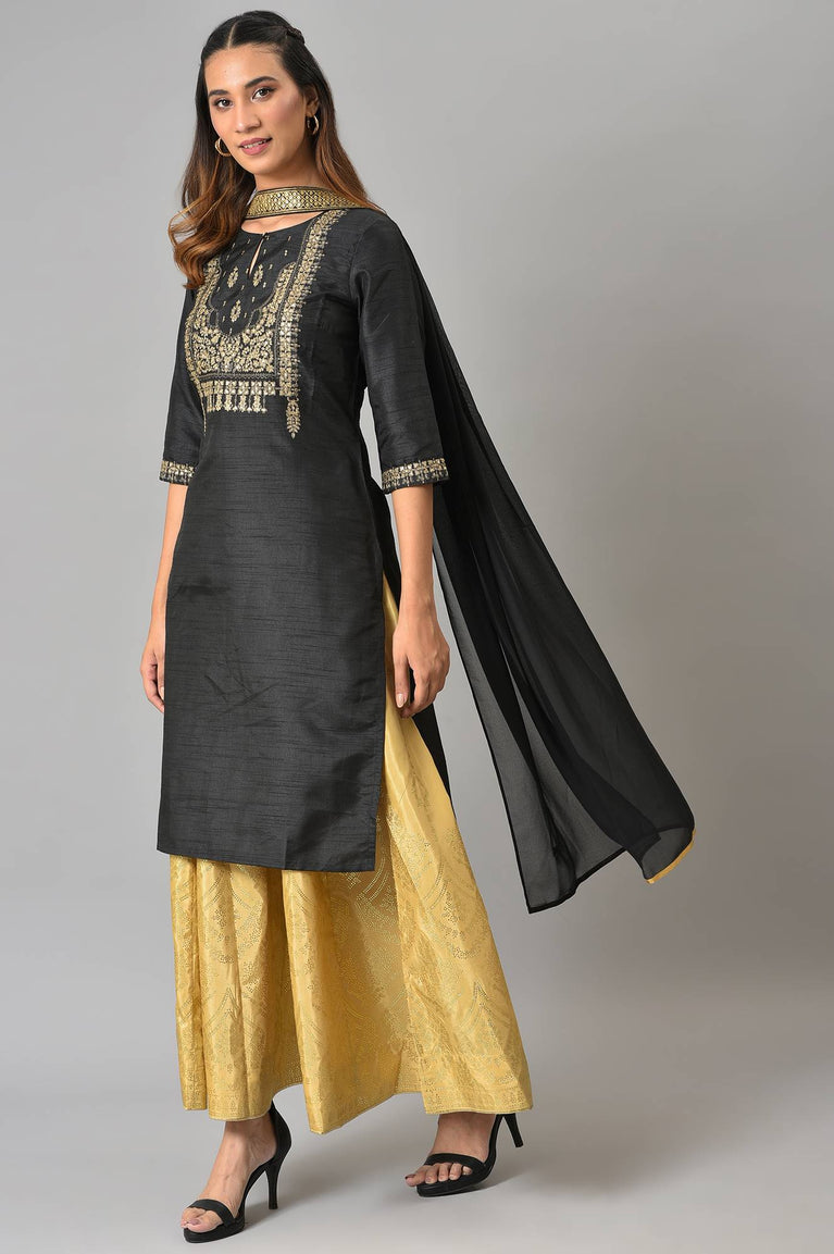 Introducing our patch printed rayon kurta set, a stylish choice for any occasion. The kurta has round neckline adds a classic touch, while the tab-look belt detail creates an intriguing element. It is paired with navy blue tights and cotton dupatta.