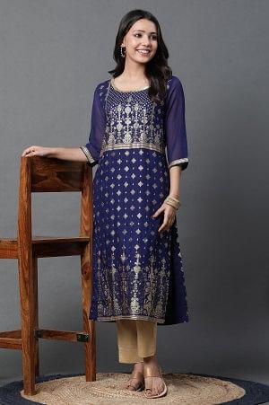 Get Ready For The Day Event In This Summer Season With This Pretty And Smoothing Blue kurta Set. The Set Has Glitter Printed A-Line kurta In Round Neck. It Is Paired With Printed Pants And Ecru Glitter Printed Dupatta.