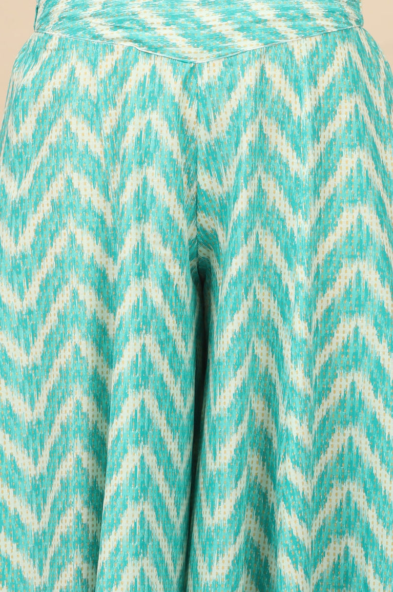 Get ready for the light festive look with this pretty foil printed kurta set. The kurta has embellished round neckline and printed border on sleeves' hem. It is paired with contrasting green printed palazzos and dupatta.