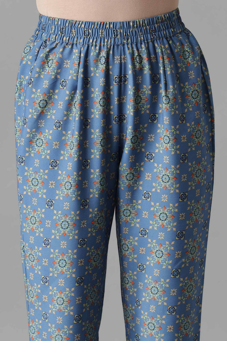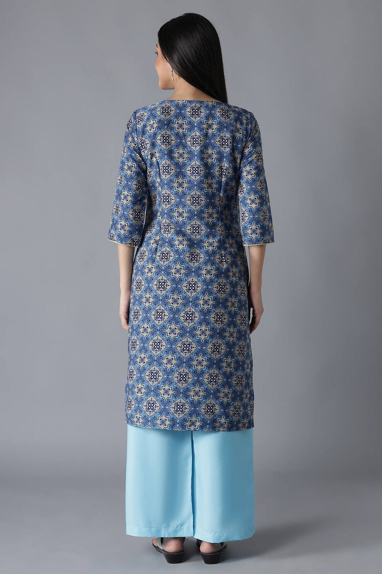 Go forth and dazzle them with this classy yet trendy kurta set. Featuring a blue all-over geometric print kurta that has a zari embroidered round neck and three-quarter sleeves. Well-matched with ankle length solid flared palazzos.
