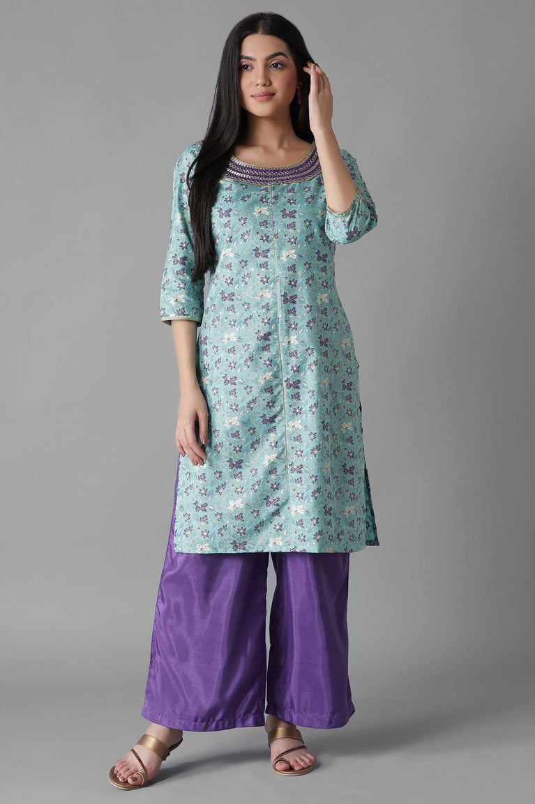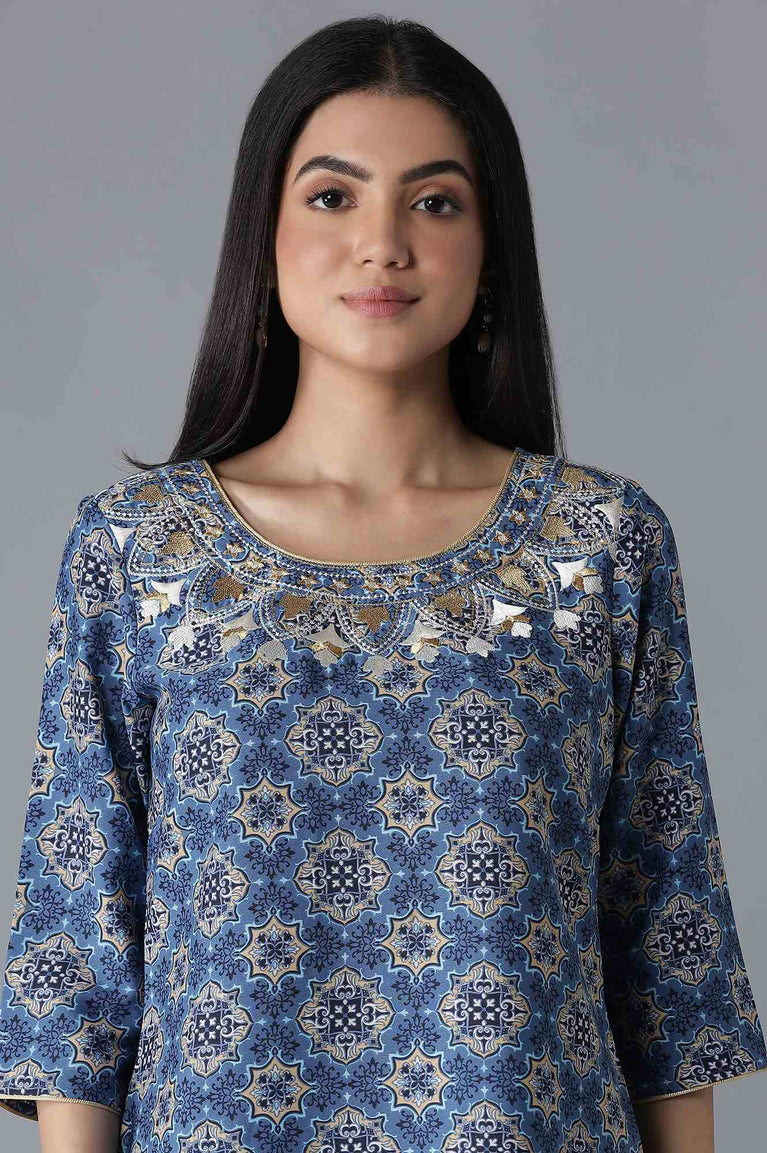 Dress up in the classic silhouettes with intricate detailing, lavish prints and rich hues to accentuate your festive look. This kurta set contains a blue glittered geometric print panelled kurta featuring zari embroidered yoke with round neckline and three-quarter sleeves. Well-matched with ankle length solid palazzos.