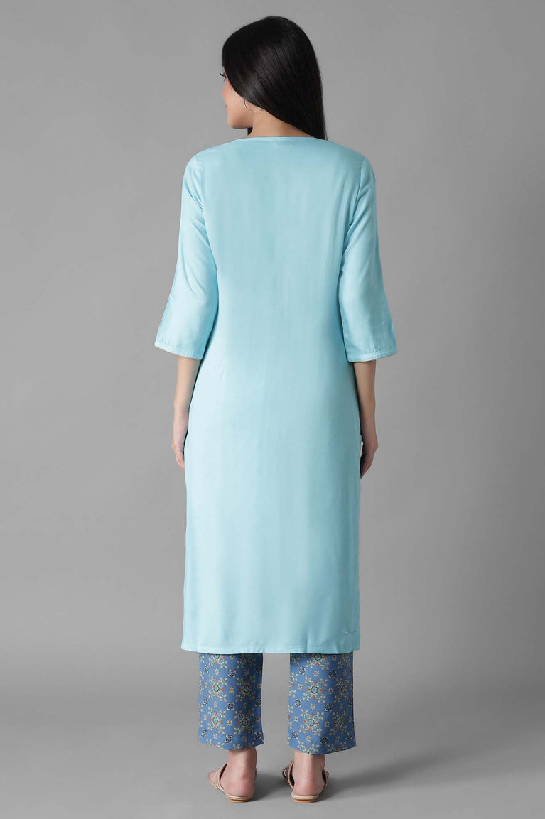 Elevate your ethnic wear collection with this exquisite Aurelia ensemble for women. This set features a straight kurta, palazzos, and a dupatta in a beautiful sky blue hue, perfect for special occasions. Crafted from 100% pure cotton, it ensures maximum comfort and breathability. The kurta boasts a round neckline, three-quarter sleeves, and elegant lace detailing, while the straight-cut design offers a sleek silhouette. The fusion ethnicity adds a modern touch to this traditional outfit. With a convenient hand-wash care instruction, maintaining the set's pristine condition is effortless. Make a statement at your next event with this stunning Aurelia ethnic set that combines style, comfort, and versatility.