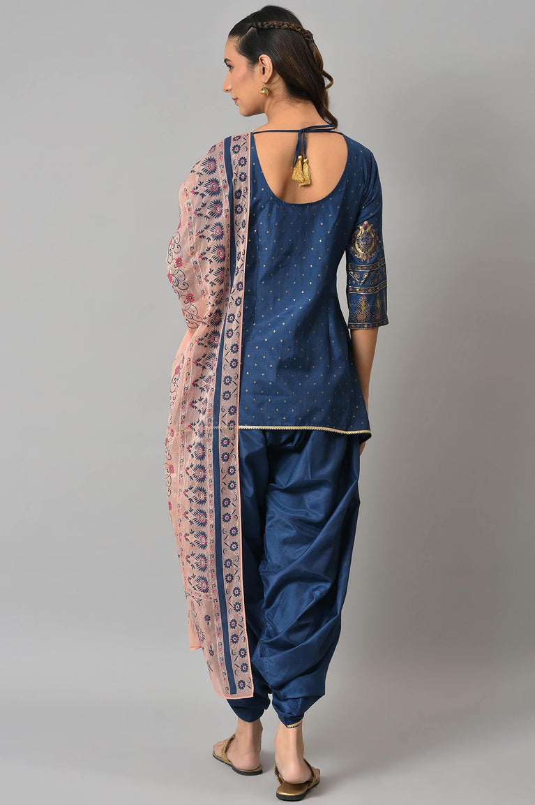 Blue Embroidered Shantung Kurta, Pants And Dupatta Set