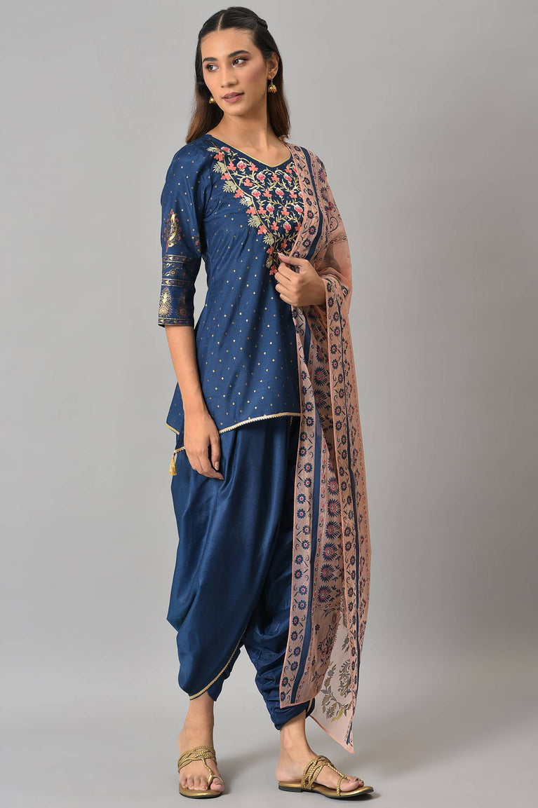 Blue Embroidered Short kurta with Dhoti Pants and Peach Dupatta