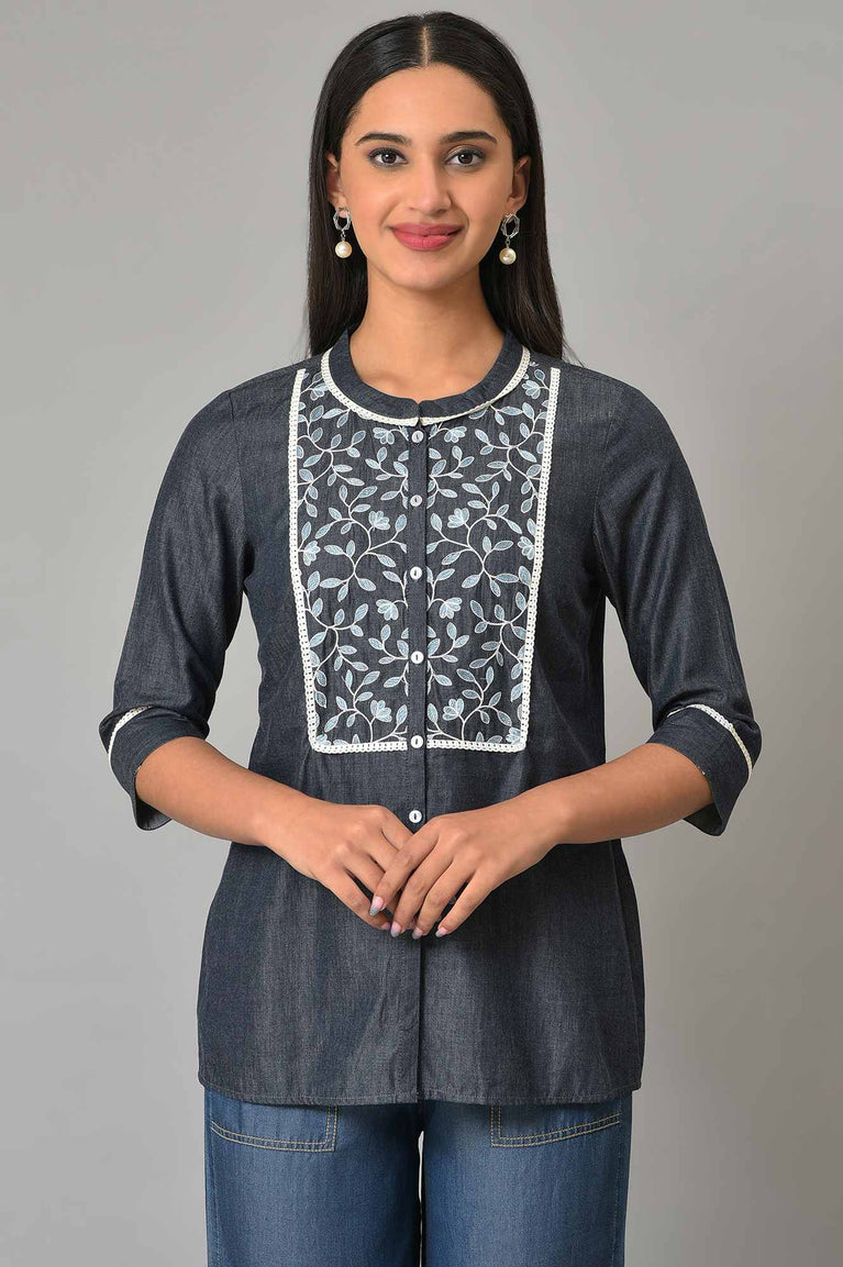 Be effortlessly stylish with this contemporary set. This set includes blue dori embroidered kurta and paired with blue denim narrow pants.