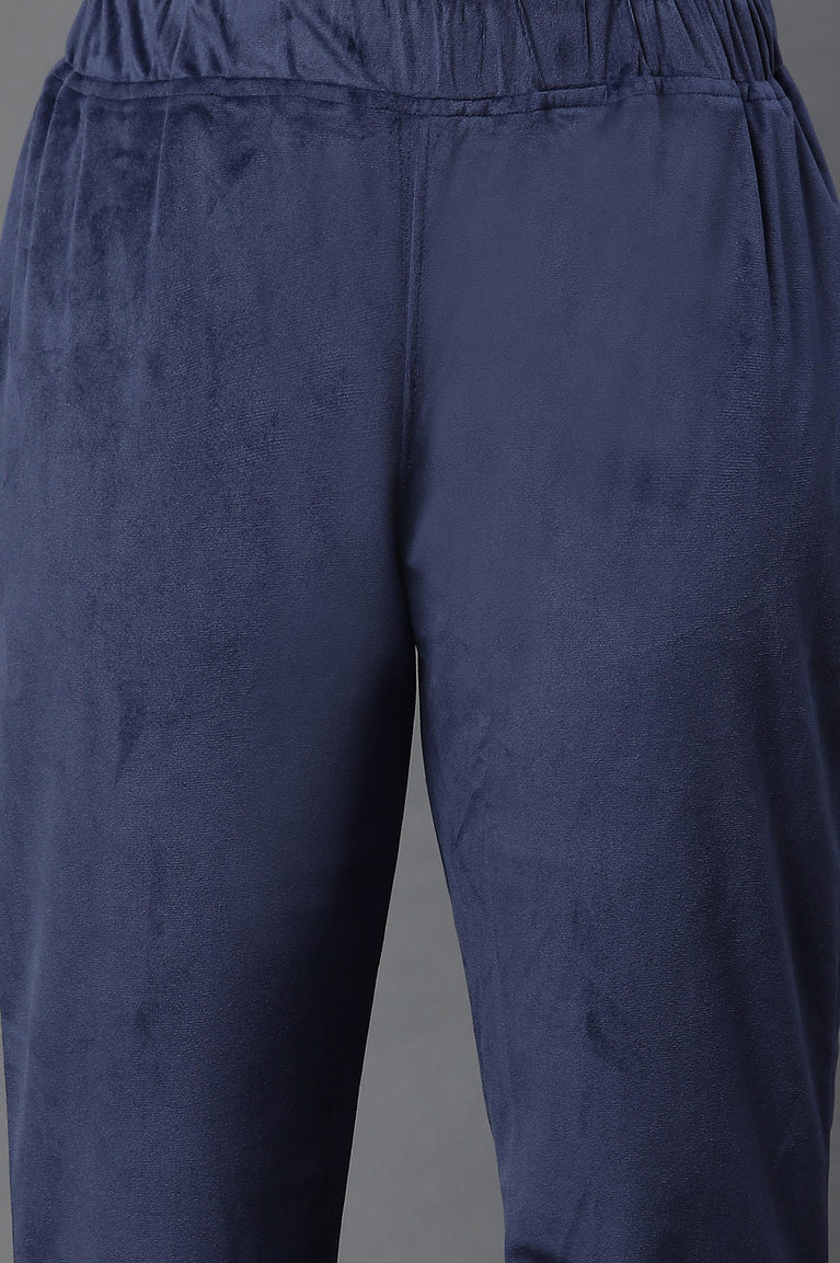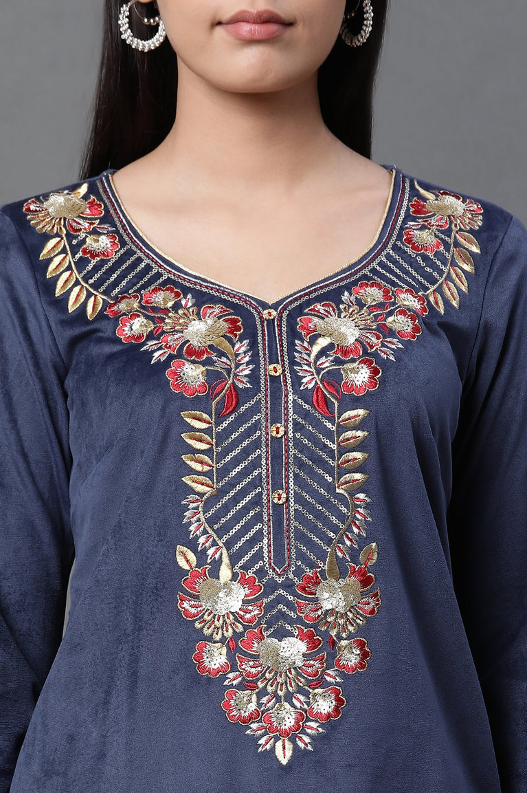 Blue Embroidered Velvet Winter Kurta and Pants Set