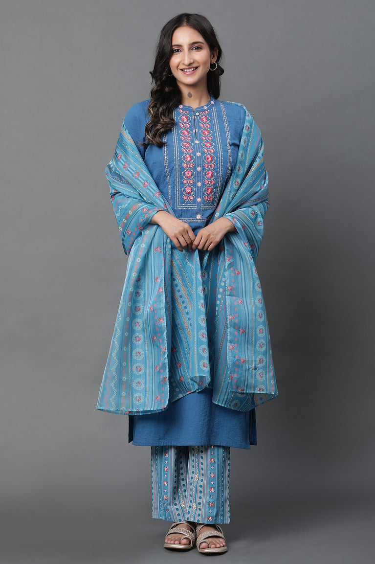 Blue Embroidered Seer Sucker Straight Kurta, Palazzo and Dupatta Set
