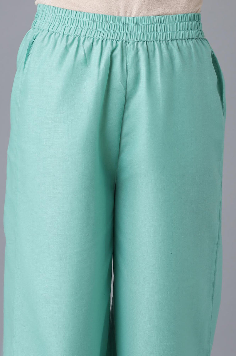 Revamp your casual ethnic wear wardrobe by adding these modern set. The set includes a brown straight fit kurta having thread embroidery on yoke and green straight palazzo pants.