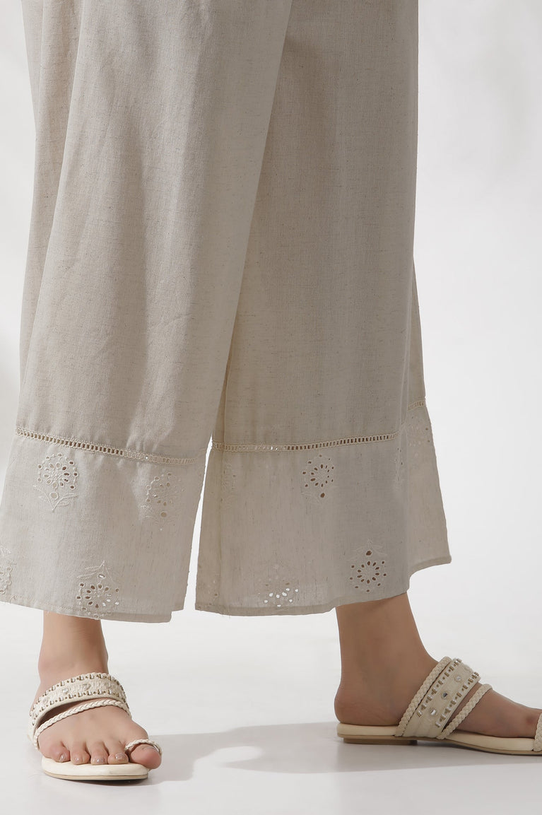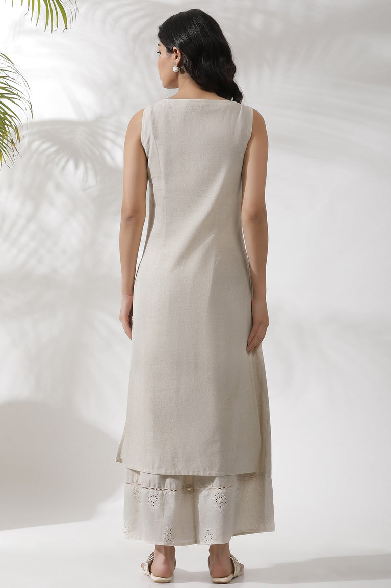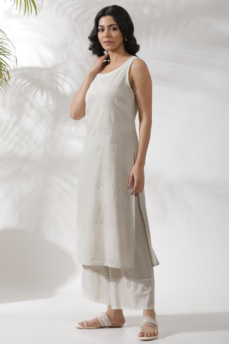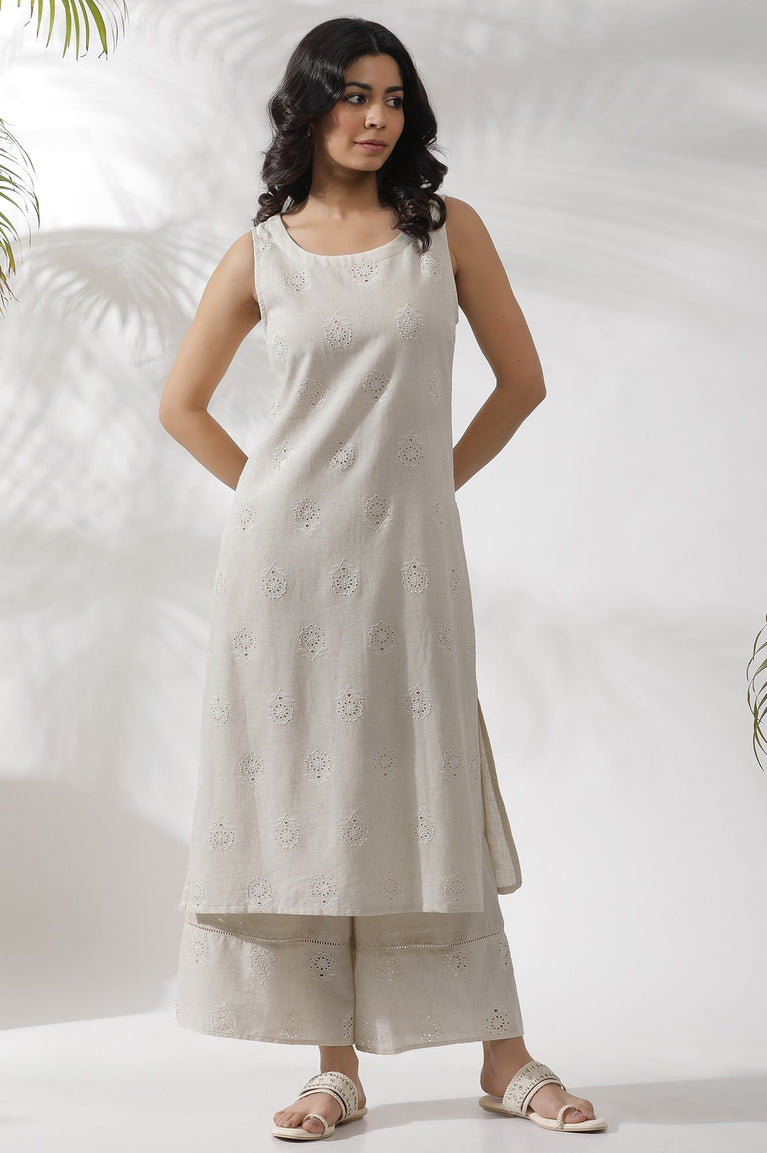 Beige Sleeveless Kurta, Featuring Tonal Schiffli On Cotton Flax. It Is Paired With Cropped Flared Pants With Lace And Schiffli Panel At Hemline.