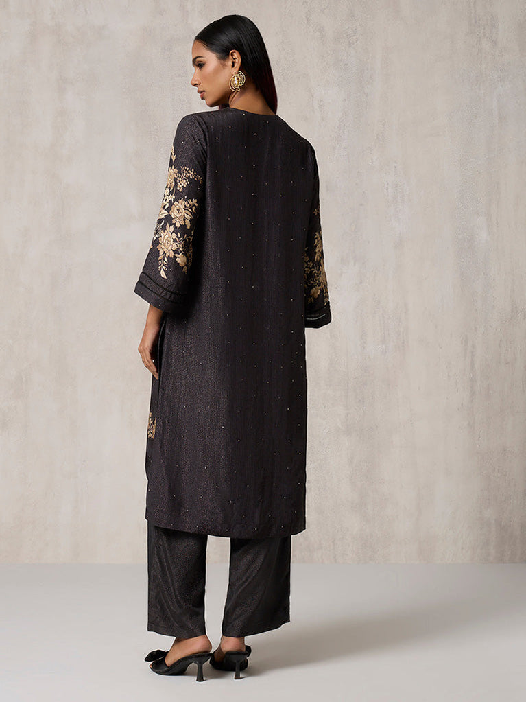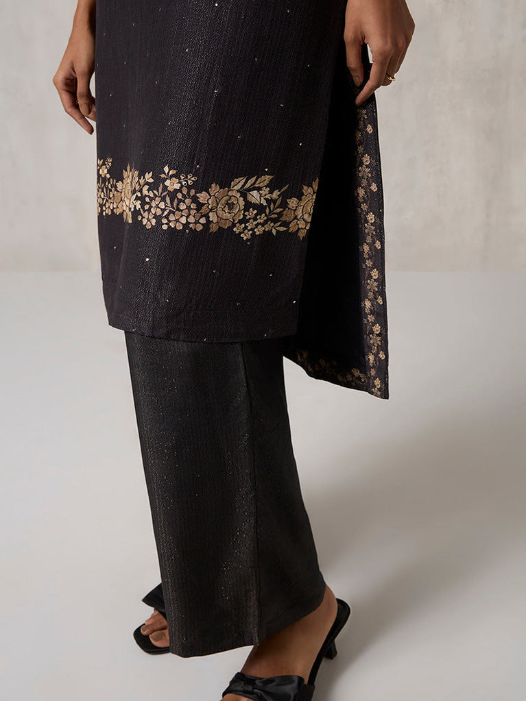 Timeless and regal, this black kurta set is illuminated with intricate floral designs that trails along the sleeves and hem. Crafted in a subtly textured fabric, the straight silhouette and round neckline with keyhole detail exude effortless sophistication. Paired with wide-leg trousers, it’s a study in contrasts — dark, gleaming, and undeniably elegant for festive evenings.