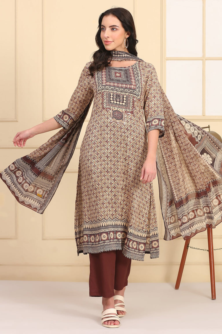 Brown Printed Ethnic Dress-Dupatta Set