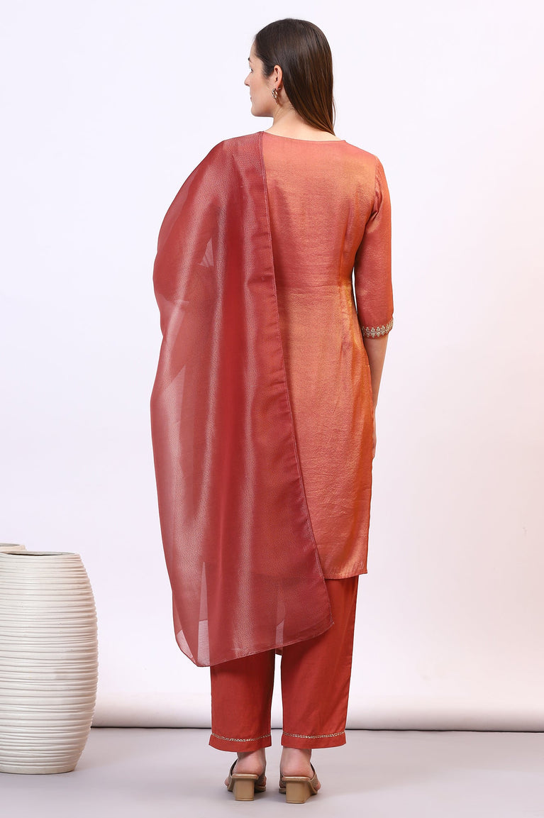 Brown Zari Embroidered Festive Straight Kurta, Palazzo Set with Dupatta