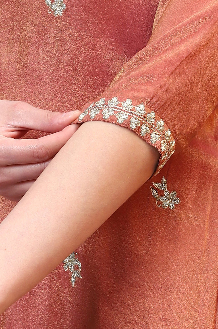 Shine this festive season with a stunning zari-embroidered kurta set crafted from luxurious tissue fabric and fully lined for comfort. The rich texture and intricate embroidery exude opulence, while the ombre-effect elevated drape adds a contemporary flair. Perfect for special occasions, this ensemble blends tradition and modernity with grace and sophistication.