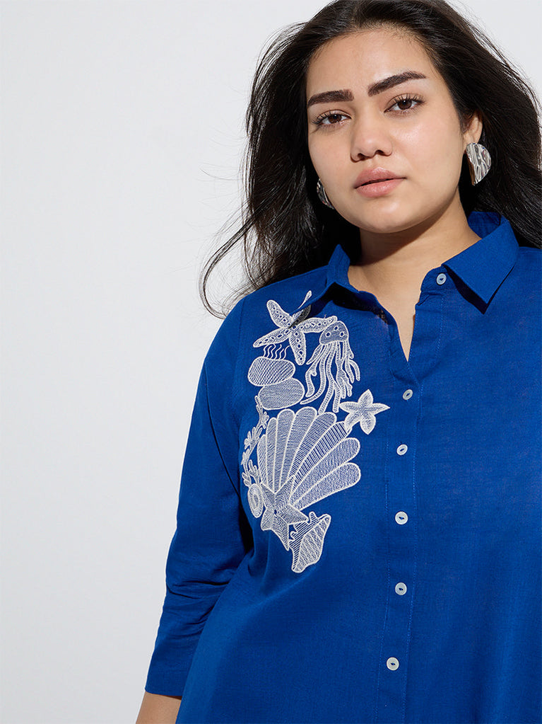 This blue kurta from Diza showcases sea life-inspired embroidery at the front. Spun from pure cotton and shaped in an A-line silhouette, it promises breathable comfort and a flattering fit. The design is complete with a spread collar, a button placket, and a practical slip pocket.