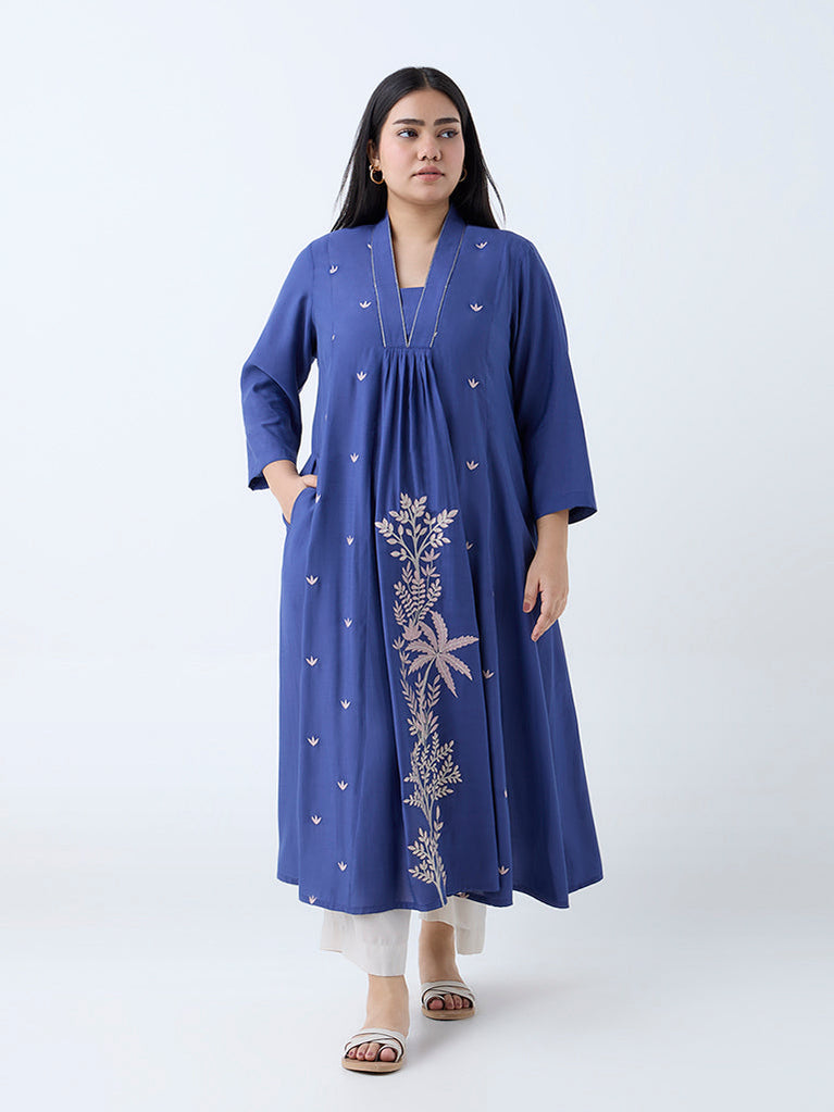 Diza Blue Floral Detailed A-Line Cotton Kurta