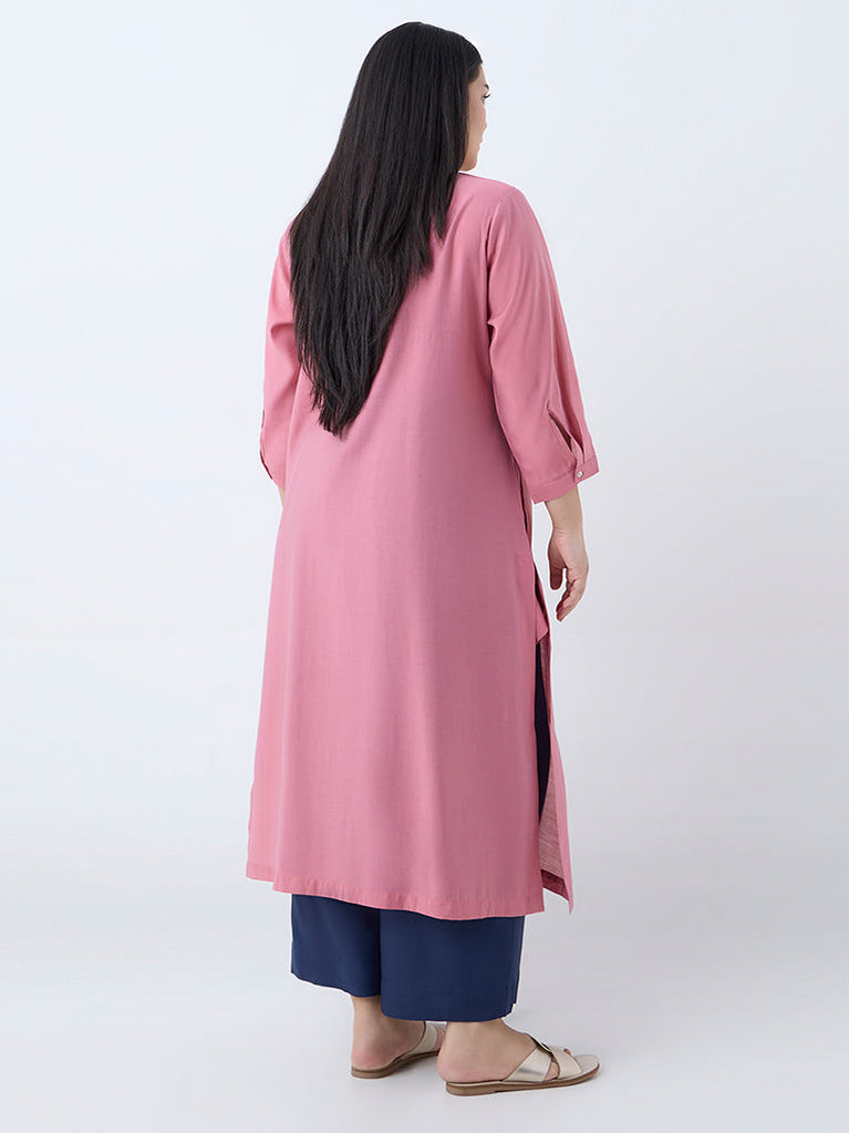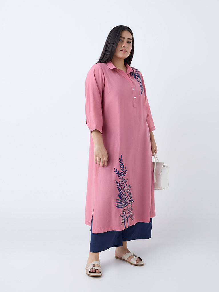 This dusty pink kurta from Diza is tailored in a graceful A-line silhouette. Milled from an ultra-lightweight fabric, it flaunts leaf embroidery for added style. A sharp collar flows into a buttoned placket, while three-quarter sleeves and a slip pocket complete the design with quiet functionality.