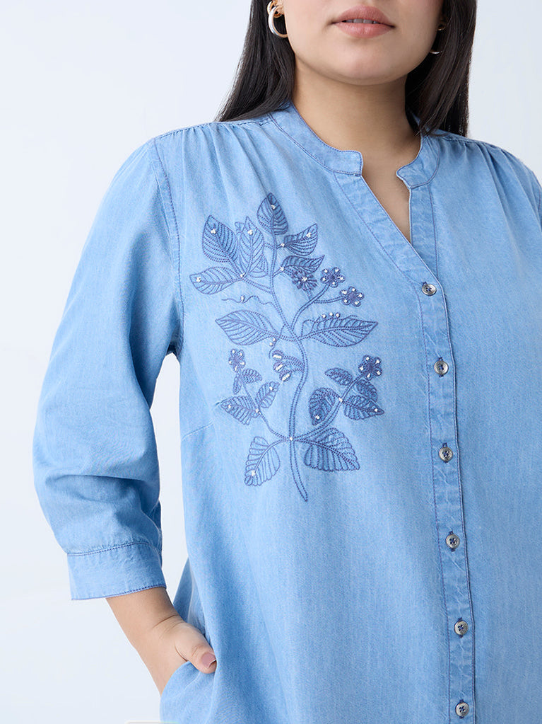 Diza Blue Floral Embroidered Straight Denim Kurta