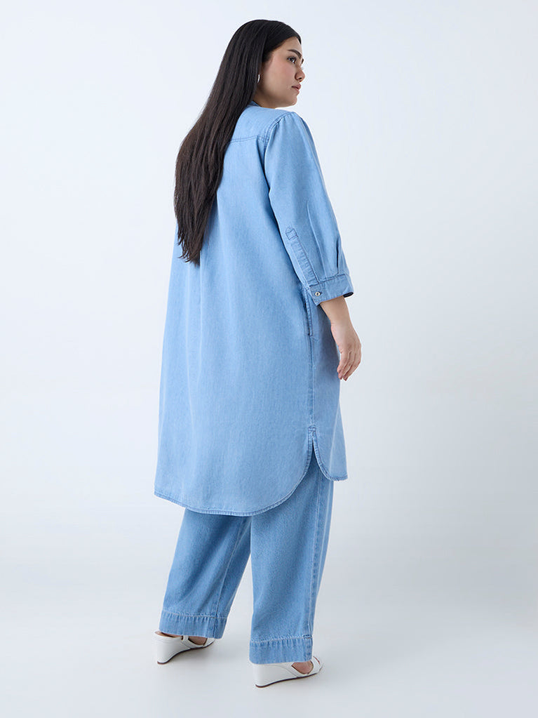 This blue denim kurta from Diza adds a modern touch to your ethnic repertoire. Showcasing floral embroidery at the front, it is crafted from a soft cotton-blend and styled with a notched neck, button placket, and three-quarter sleeves. Side pockets complete the look with practical ease.