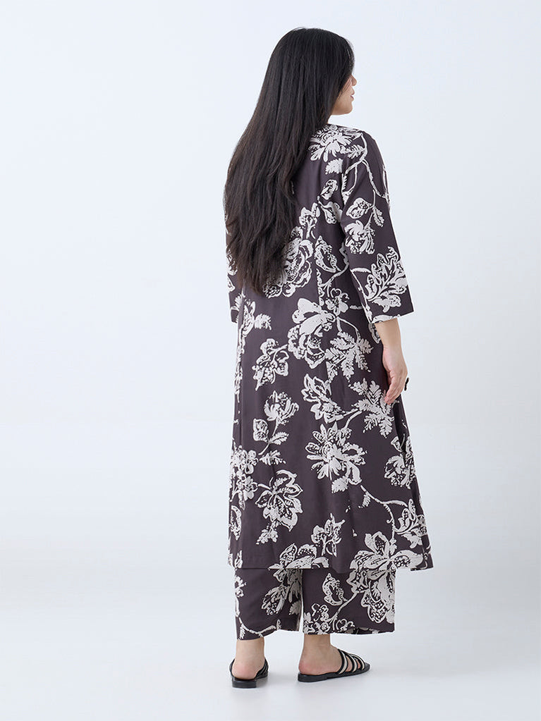 Diza Dark Brown Floral Pattern A-Line Kurta