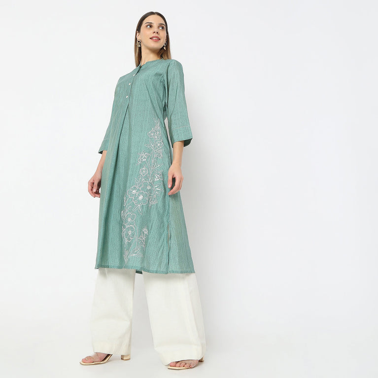 Below Knee Band Collar Embroidered A-Line Kurta