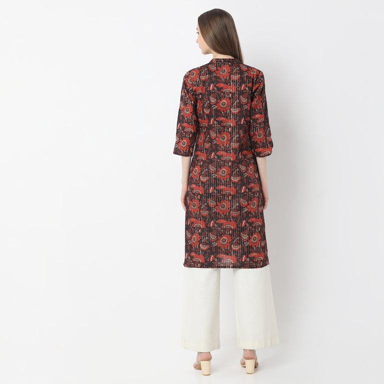 Embrace timeless elegance with this pure cotton kalamkari kurta, designed for effortless everyday grace. Featuring the traditional Kalamkari print in earthy tones, this kurta is crafted in breathable cotton slub fabric, offering both comfort and style. The button placket at the front adds a classic touch, while the cuffed sleeves lend a structured finish, making it suitable for both work and casual wear. The straight silhouette ensures a flattering fit, and the muted beige backdrop beautifully enhances the intricate detailing of the print. Pair it with neutral bottoms or denim for a versatile, ethnic-chic look.