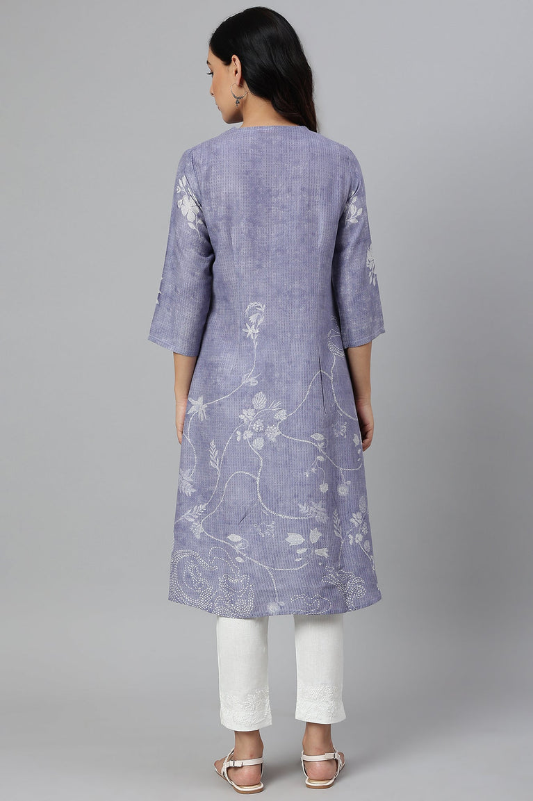Blue Embroidered Printed Thread Embroidery Rayon Flax A-line Kurta