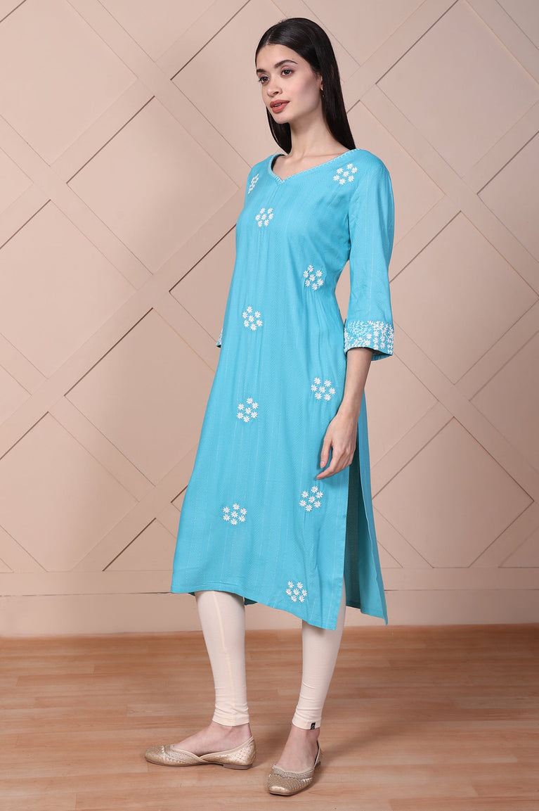 An expression of serene style, this kurta for women is bathed in a breathtaking Oceanic Teal hue. It's the kind of everyday apparel that feels both special and incredibly easy to wear, promising to become a cherished part of your wardrobe. The design follows a timeless straight silhouette, creating a clean, flattering line that glides effortlessly. A classic V-neckline provides the perfect frame, leading the eye to a sprinkle of charming floral motifs. These delicate designs, rendered in crisp white thread work, are scattered across the front, adding a touch of artisanal grace. You'll love the detail on the three-quarter sleeves, which are finished with beautiful, dense embroidered borders, a testament to its thoughtful craftsmanship. This ethnic tunic is fully opaque for confident wear, and its straight hemline features practical side slits for unrestricted movement. This beautiful straight cut kurti is a singular statement of understated elegance. Perfect for pairing with your favorite leggings or palazzos, it’s a versatile choice for everything from a casual workday to a weekend brunch with friends, offering a fresh take on classic ethnic wear.