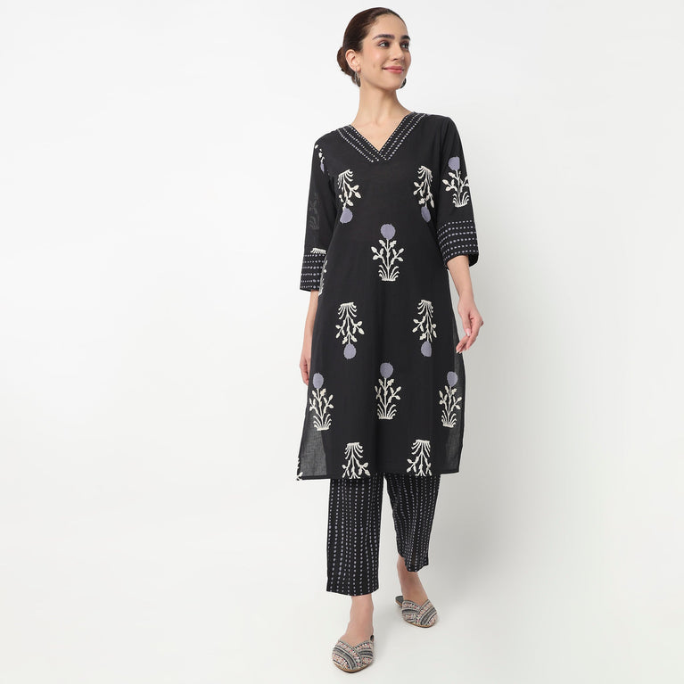 This black kurta from Diza is crafted in pure cotton and adorned with delicate floral embroidery across the front, lending an artisanal touch to its A-line silhouette. Finished with a flattering V-neckline, three-quarter sleeves, and a practical slip pocket, It is a polished wardrobe staple for effortless festive dressing.