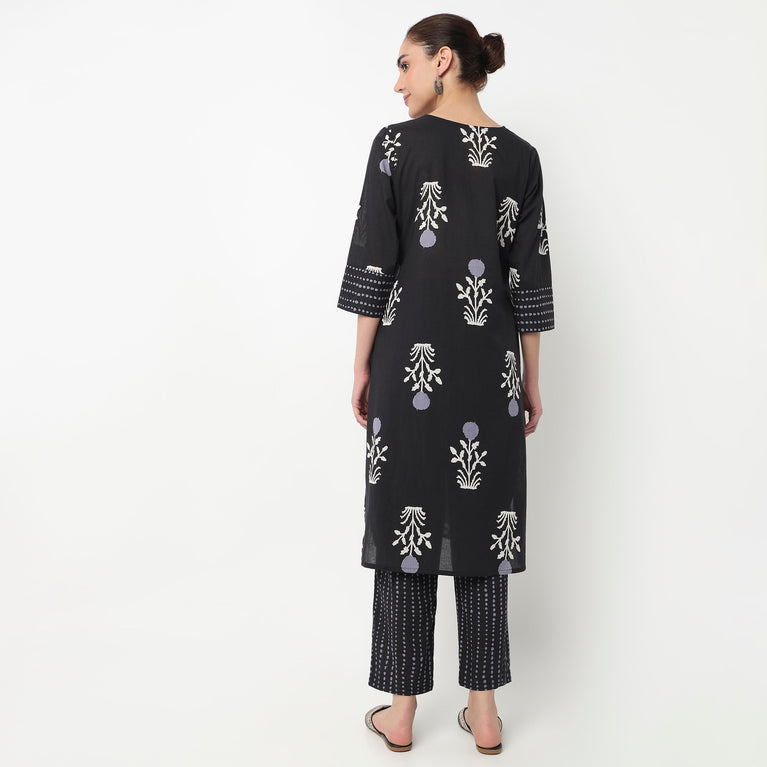 Diza presents this black A-line kurta adorned with a floral print for a timeless appeal. It features a band neck, button-down front, and three-quarter sleeves, along with practical side pockets. Crafted from a quality fabric, it ensures comfort with every wear.