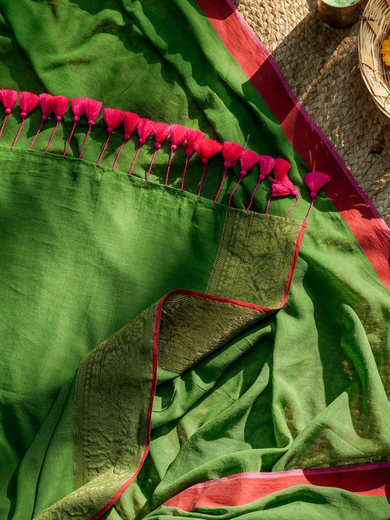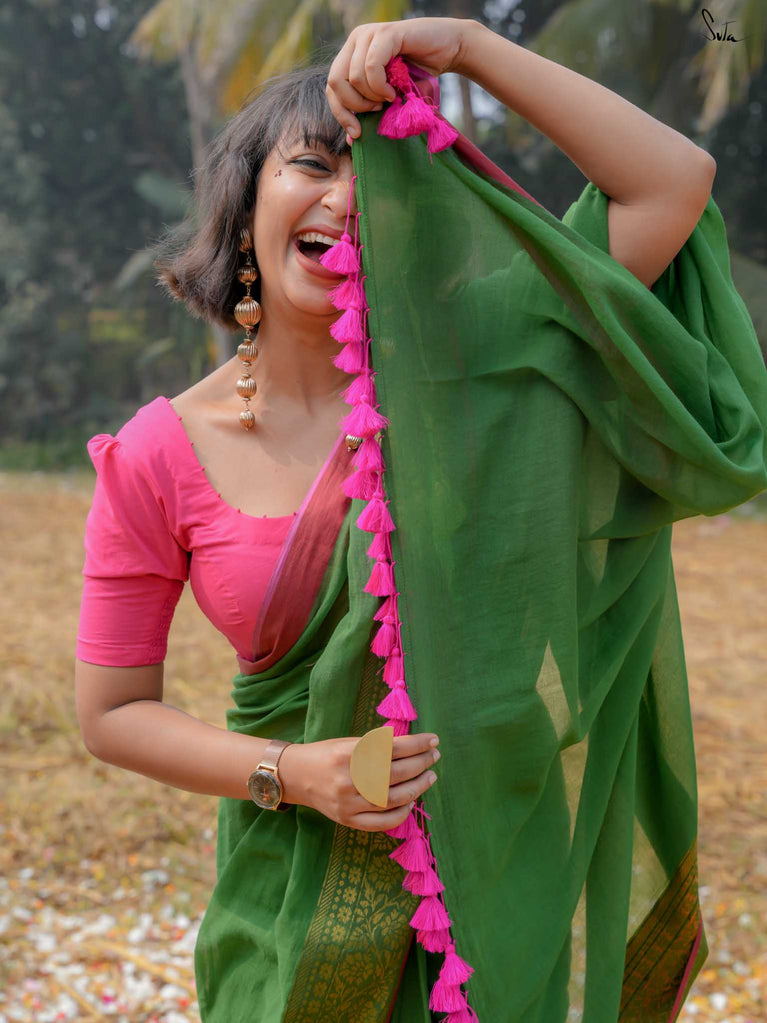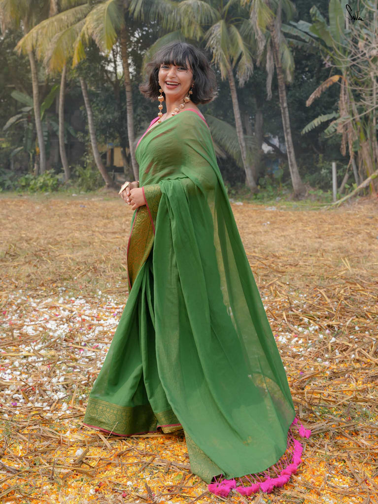 Deep, rich, and full of soul, this olive green mul cotton saree is a tribute to the timeless beauty of henna, the intricate art that decorates the hands of every Holi celebrant. The jacquard weave and zari-woven contrast border bring a subtle elegance, while the shimmering tassels capture the magic of the festival. This saree speaks of connections, of traditions passed through generations, and of the deep beauty found in every celebration.