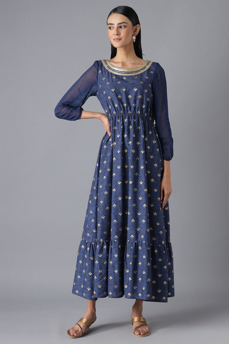 Festive dress for women crafted in soft Liva fabric, this blue ensemble with floral print and zari embroidery is designed to bring elegance to every celebration. The flowy dress silhouette ensures effortless charm, while the delicate zari highlights add festive sparkle. A matching dupatta completes the look, creating a coordinated outfit for weddings, parties, or festive gatherings. Comfortable to wear and easy to carry, the Liva fabric offers a soft, breathable texture that enhances all-day wearability. The floral print blends beautifully with the embroidered details, striking a balance between contemporary style and traditional craft. Whether accessorized minimally for an elegant vibe or with bold jewelry for grandeur, this dress set is a versatile choice for your ethnic wardrobe. Perfect for women who love festive dressing with modern comfort.